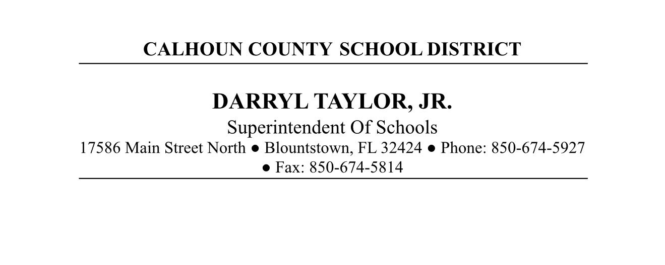CALHOUN COUNTY SCHOOL DISTRICTDARRYL TAYLOR, JR.Superintendent Of Schools17586 Main Street North ● Blountstown, FL 32424 ● Phone: 850-674-5927 ● Fax: 850-674-5814Toys For Tots The Calhoun County S...